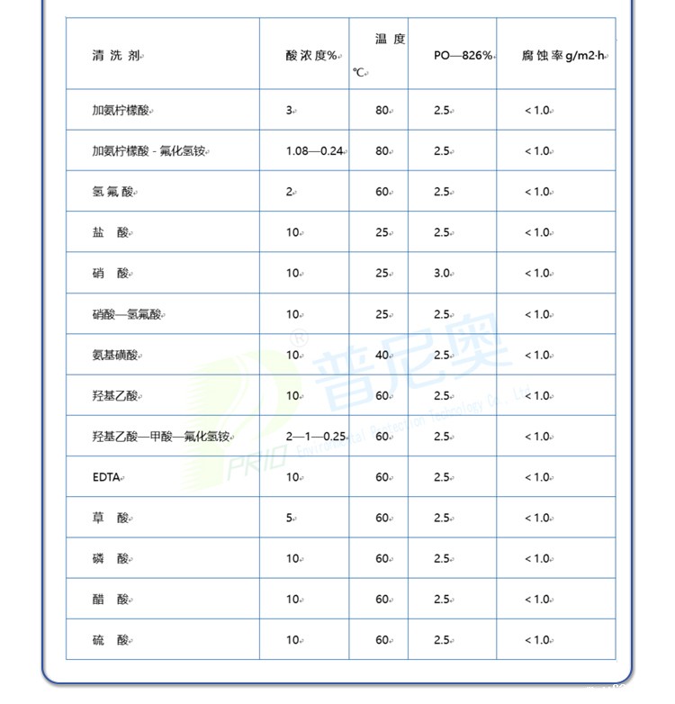 根据选定的酸种按附表确定PO-826的用量。使用步骤:连接好清洗系统,在配液箱中加入计量的水-加入计量的PO-826缓蚀剂搅拌均匀-边搅拌边加入计量的浓酸混合均匀-注入设备,按常规的化学清洗工艺进行清洗。PO-826在各种介质中的添加量和缓蚀效果(20号钢)