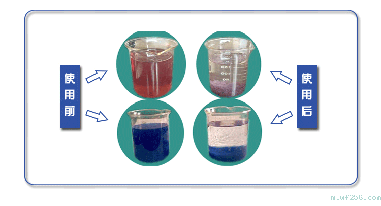 1、用10-40倍的水稀释高效脱色絮凝剂,然后直接投入水中,搅拌数分钟后进行沉降或气浮,即可得到脱色后的清液。