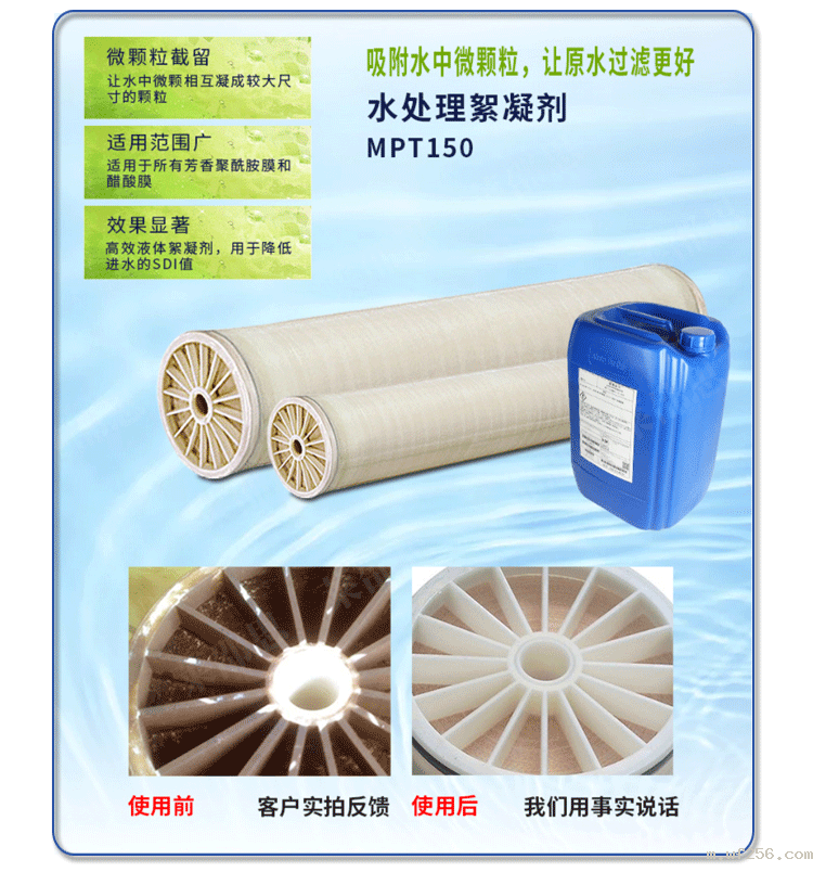 MPT150简洁地说是高分子有机凝结剂,可以直接在多介质过滤器前加入。