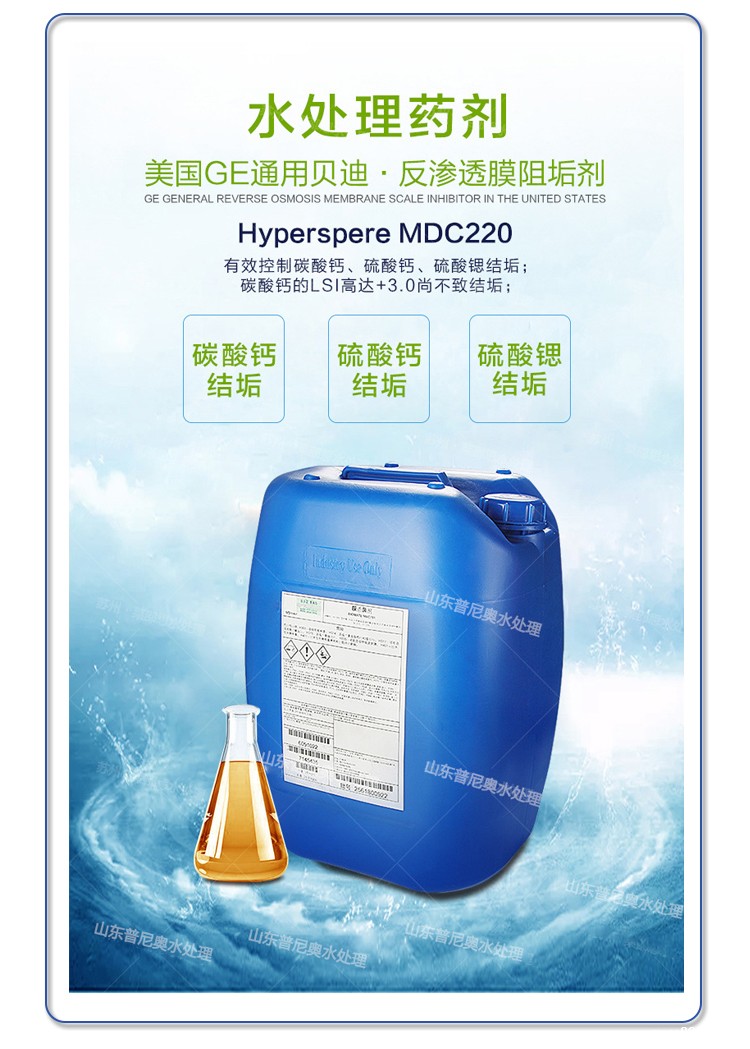 MDC220是一种高效液体阻垢剂,用于控制膜分离系统中的结垢沉积物,减少微粒阻塞。应用该产品可以延长运转周期和设备使用寿命,从而降低操作和投资费用。该产品已广泛应用于反渗透及纳滤装置中。