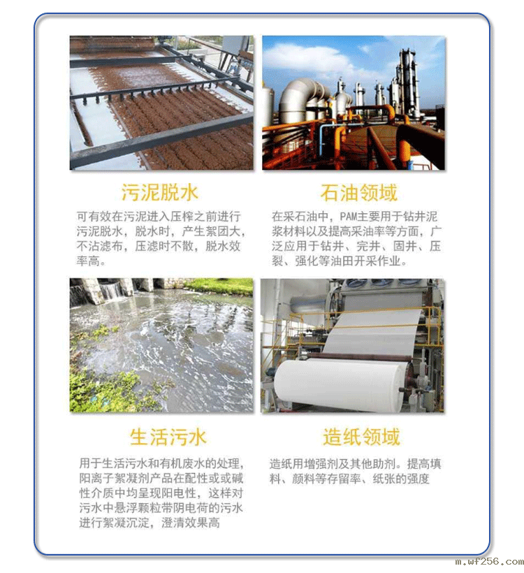 阴离子聚丙烯酰胺(APAM)是水溶性的高分子聚合物,主要用于各种工业废水的絮凝沉降,沉淀澄清处理,如钢铁厂废水、电镀厂废水、冶金废水、洗煤废水等污水处理、污泥脱水等。还可用于饮用水澄清和净化处理。由于其分子链中含有一定数量的阴性基团,它能通过吸附水中悬浮的固体粒子,使粒子间架桥或通过电荷中和使粒子凝聚形成大的絮凝物,故可加速悬浮液中粒子的沉降,有非常明显的加快溶液澄清,促进过滤等效果。