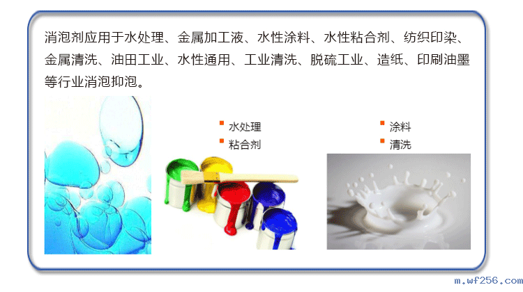有机硅液体消泡剂是一种于水相系统的高效消泡剂,在水中分散极易,使用方便。在很宽的 pH 及温度范围内具有快速的消泡效力和抑泡功能,与各类助剂配伍良好,能消除泡沫,并具有防止泡沫再生的功效。在水中易分散。有机硅液体消泡剂广泛适用于污水处理、印花制浆、漂染、生物素发酵、水性助剂加工、造纸、农药、洗涤、粘合剂、油墨涂料、等领域。高温强碱的化学清洗中的消、抑泡及高温强碱的水相体系中的消泡;对抑泡要求比较高的体系。